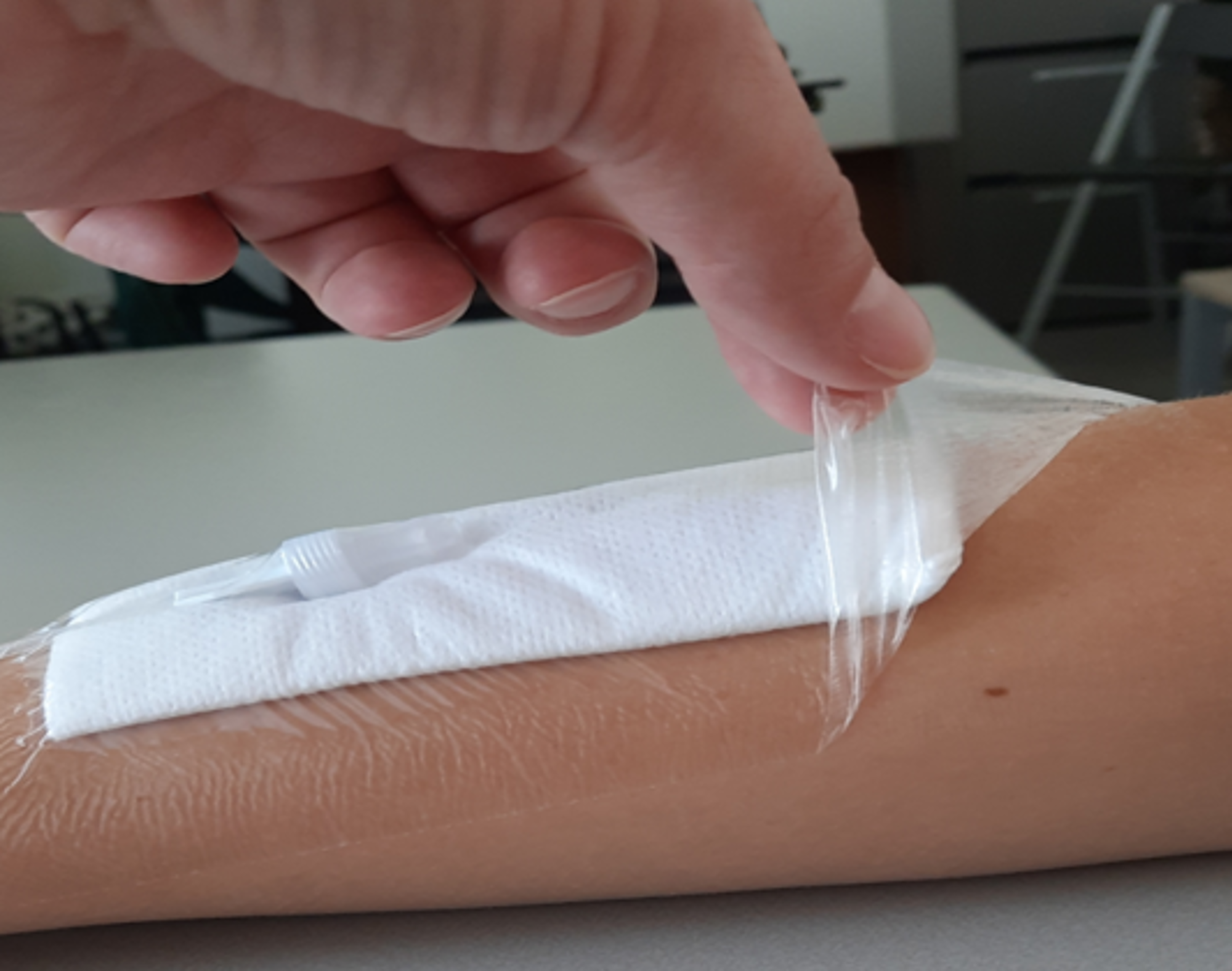 - Verwijder voorzichtig de pleister rondom de PaJunk katheter. Als de pleister erg vast zit kunt u hem losweken met wat water.