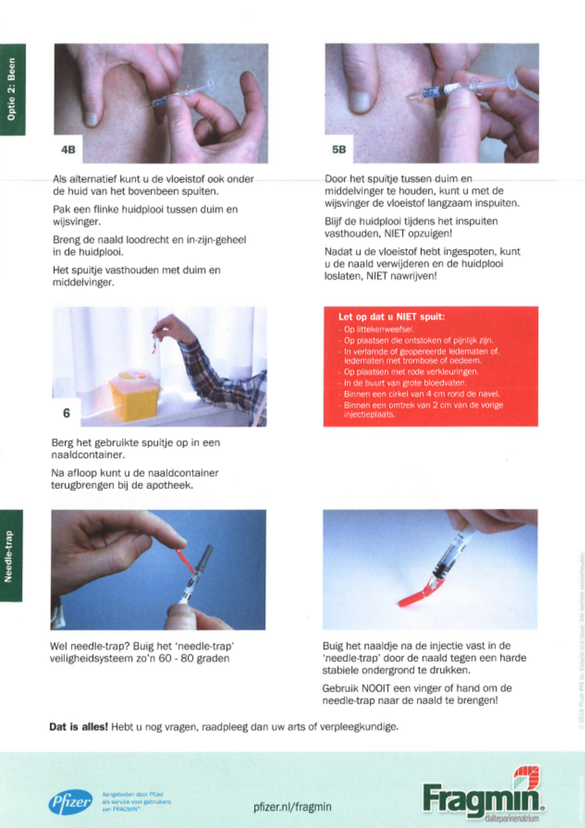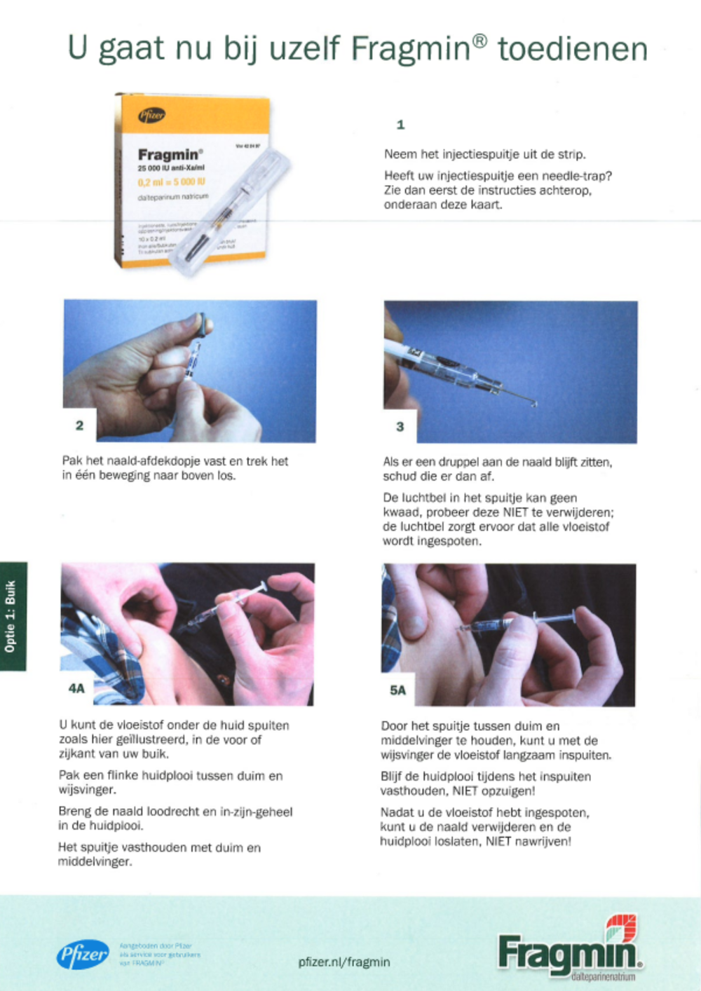 U heeft samen met de zorgverlener besloten om Fragmin zelf toe te dienen. Hieronder vindt u de instructiekaart. Lees ook deze algemene informatie over Subcutaan injecteren.