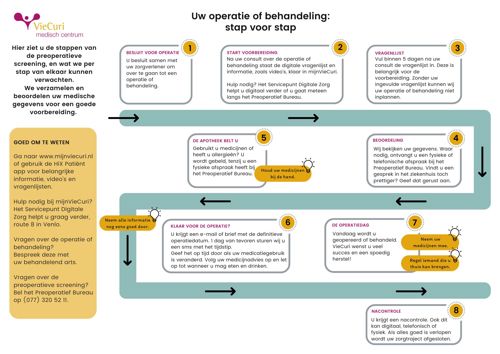 De preoperatieve screening kan in het ziekenhuis, via de telefoon of volledig digitaal plaats vinden. Dit is afhankelijk van uw voorkeur, de ingreep en/of uw gezondheid. In deze routekaart ziet u de stappen van de preoperatieve screening, en wat we per stap van elkaar kunnen verwachten.