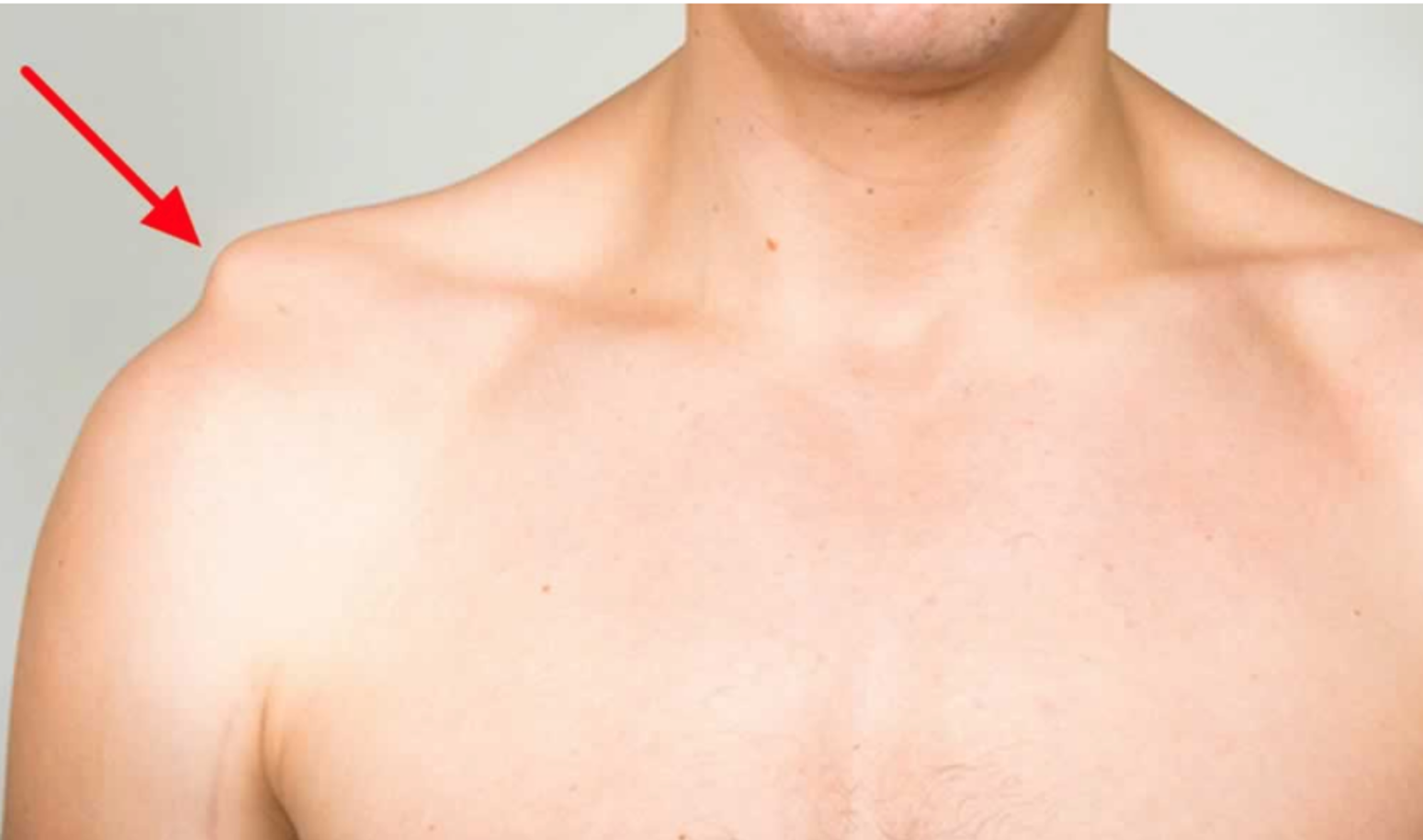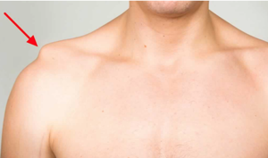 Bij een val op de schouder kan het zijn dat de verbindende bandentussen het sleutelbeen en het schouderdakje afscheuren waardoor het sleutelbeen als een uitstekende bobbel te voelen is bovenop de schouder (figuur 1).