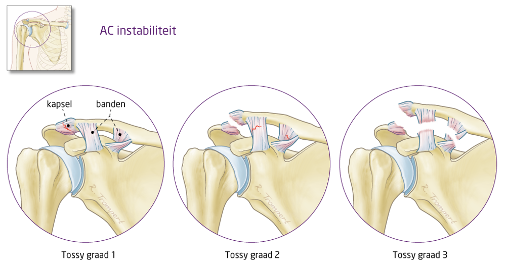 Er zijn 3 gradaties te onderscheiden waarbij graad 1 een kleine inscheuring of kneuzing is van de banden zonder dat sleutelbeen omhoog komt, bij graad 2 is een deel van de banden afgescheurd en is het sleutelbeen gedeeltelijk omhoog komen te staan en bij graad 3 zijn alle banden afgescheurd en staat het sleutelbeen behoorlijk naar boven.