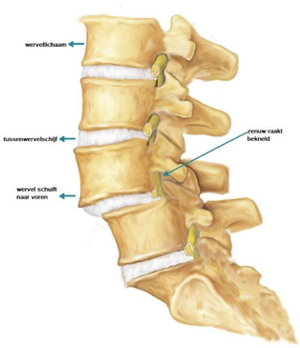 De lage of lumbale wervelkolom bestaat uit 5 lendenwervels en het heiligbeen. Tussen iedere wervel zit een tussenwervelschijf. De gewrichten zorgen voor beweeglijkheid van de rug. De tussenwervelschijf (discus) is een bindweefselring met een zacht binnen gedeelte. De tussenwervelschijf zorg voor verbinding van de wervels en functioneert als een soort 'schokbreker'.