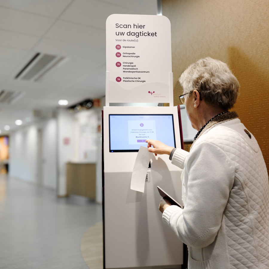 Dichtbij de afdeling waar u uw afspraak heeft, staat een kleinere zuil. U scant bij die zuil de QR-code van uw dagticket. De zuil geeft aan in welke wachtruimte u kunt plaatsnemen. Nu weet uw zorgverlener ook dat u er bent, en wordt u opgeroepen of opgehaald voor uw afspraak.