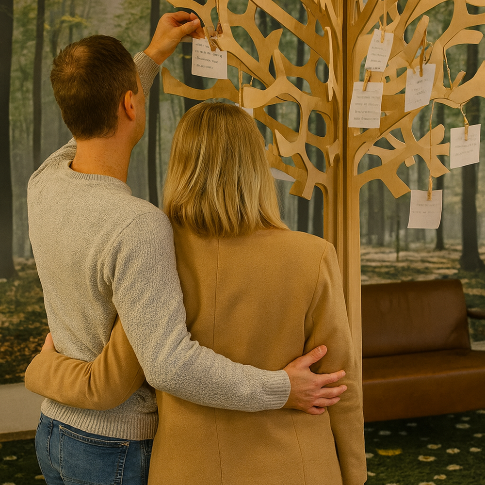 Tijdens deze week staan bij het Stiltecentrum (route 19) in ons ziekenhuis speciale bomen. Ouders, familieleden, bezoekers en medewerkers die een kindje hebben verloren zijn welkom om hier een kaartje met de naam van hun kindje of een persoonlijke boodschap op te hangen. Zo ontstaat een gezamenlijke plek van herinnering en verbondenheid. Iedereen die dat wil, kan hier in alle rust even stilstaan bij het verlies van een kind.