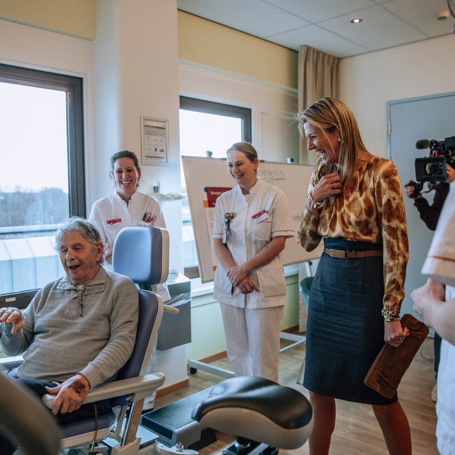 In januari 2024 bracht Koningin Máxima een bezoek aan ons ziekenhuis. Ze bezocht VieCuri om meer te horen over het programma ZE&GG. Dat programma heeft als doel dat iedere patiënt de bewezen beste zorg krijgt. De manier van werken op onze afdeling interne-ouderen geneeskunde is daar een goed voorbeeld van. Koningin Máxima kreeg er uitleg over ons concept van reactiverend verplegen.